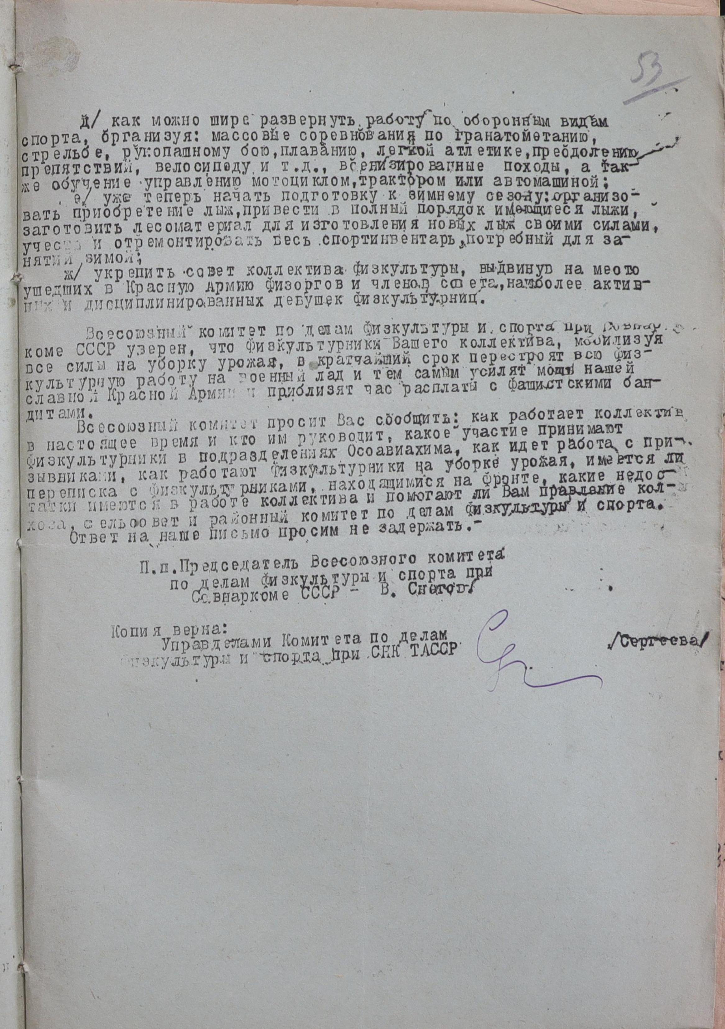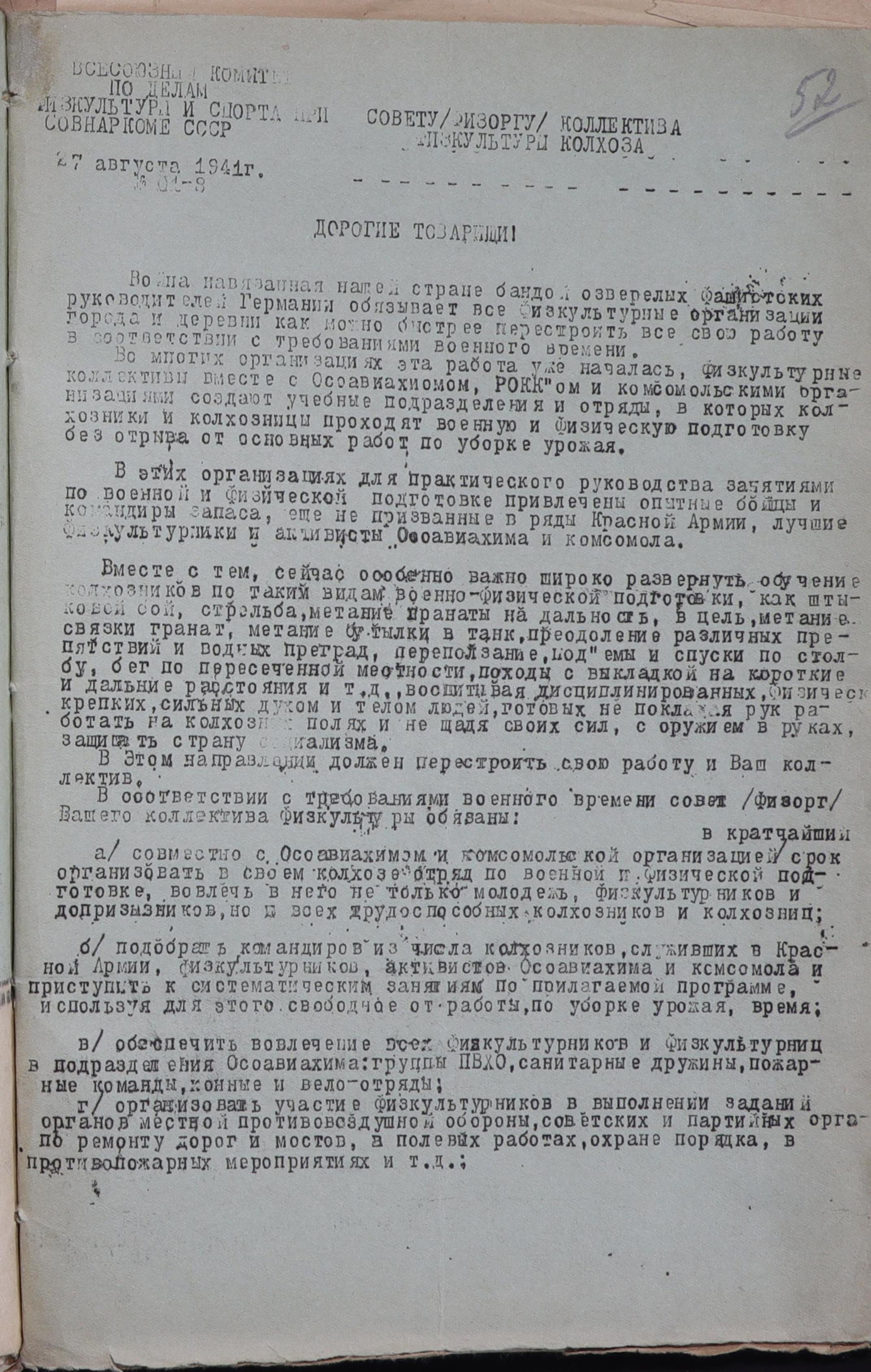 Сугыш чоры шартларында физик культура мөһим роль уйный. Физкультура оешмаларының эшчәнлеге сугыш чоры ихтыяҗларына буйсындырылган. Төп бурыч халыкны массакүләм хәрби-физик әзерләү булды. Күпләр кул сугышы, граната ыргыту, чаңгы спорты, Йөзү һәм башка күнекмәләр буенча әзерлек узган. Спорт-массакүләм эштә спортның хәрби-гамәли төрләренә-ату спортына, Автомотоспорт, су-мотор, парашют, планер клубларына күбрәк игътибар бирелде, альпинизм үсеш алды. Сугыш елларында физик культура физик үсеш чарасы гына түгел, ә эмоциональ ярдәм дә булды, героизм образларын тудырды, спортны хәрби уңышлар белән яраштырды һәм уртак эш өчен көрәштә бердәмлекне ассызыклады.