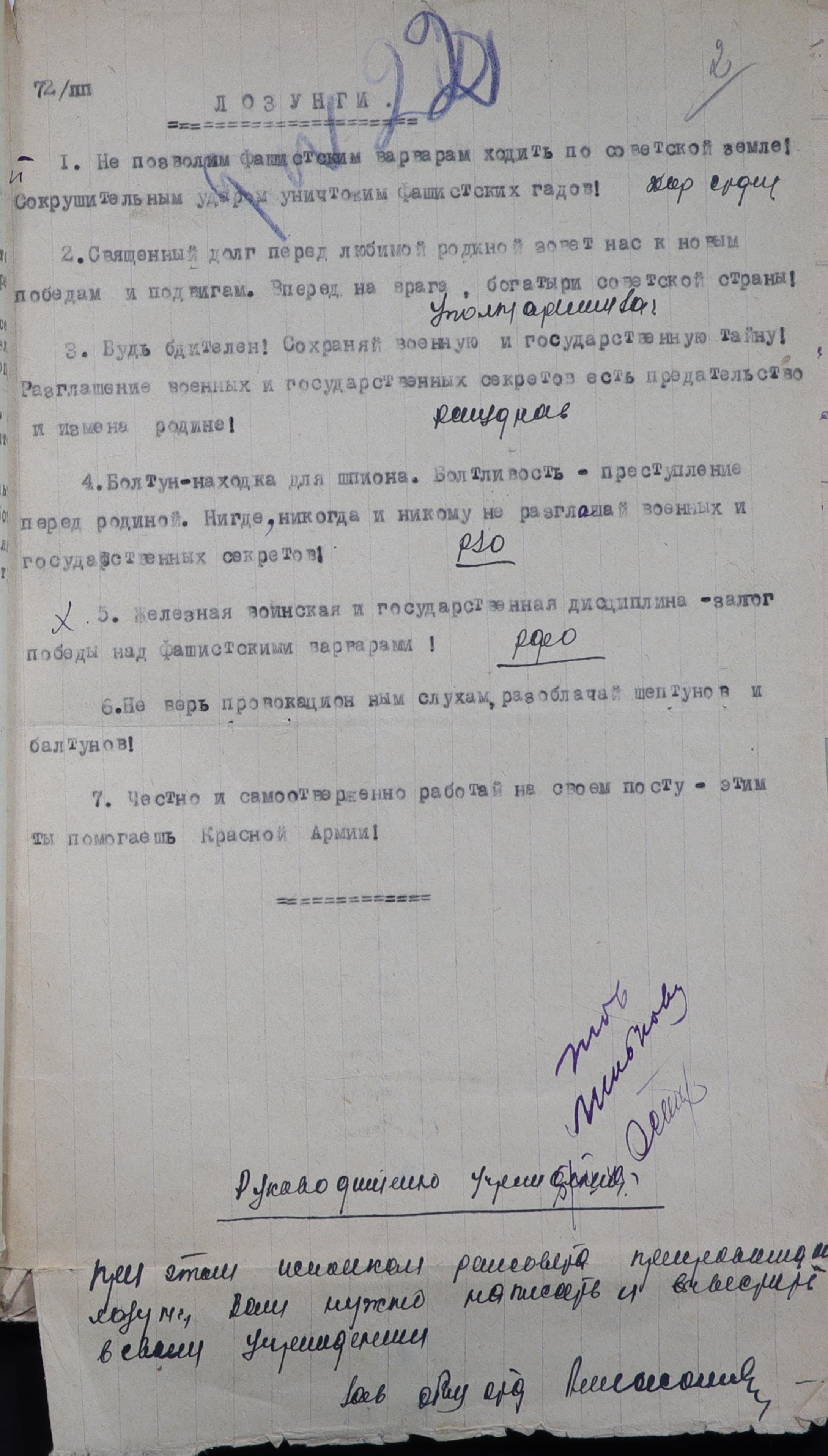 В архивных документах содержатся лозунги 1941 года, которые использовались в агитационных плакатах времён Великой Отечественной войны. Они призваны были поднять боевой дух армии и производительность труда в тылу.