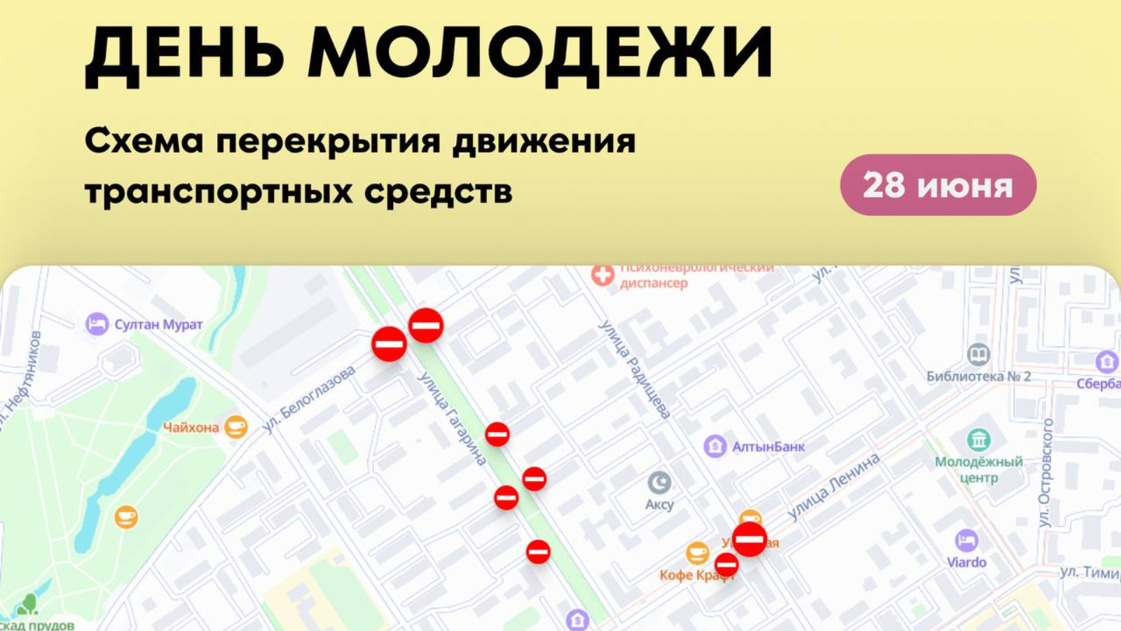 Яшьләр көнен бәйрәм итү уңаеннан, 28 июньдә 6:00 сәгатьтән 23:00 сәгатькә кадәр түбәндәге урамнар буенча хәрәкәт вакытлыча ябылачак:
