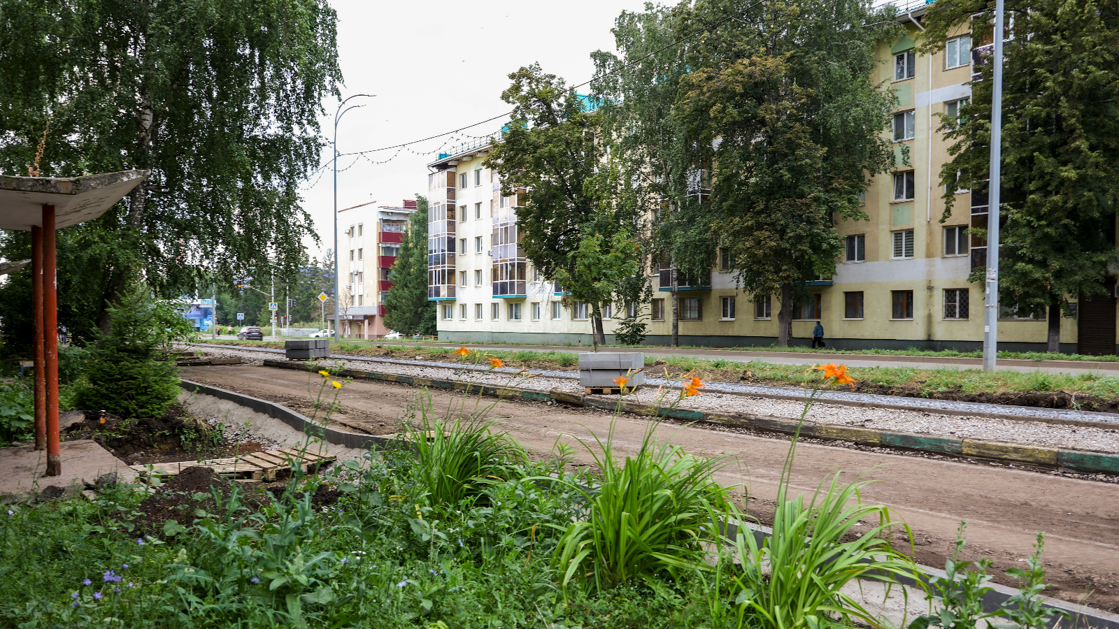 Биредә тротуарлар һәм машина йөрү өчен нигез салынган, балалар һәм спорт мәйданчыклары өчен территория әзерләнгән, яктырту өчен гофрлар куела.