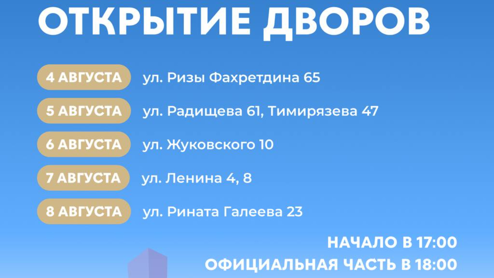 Күркәм традиция буенча, Татарстан рәисе Рөстәм Миңнеханов инициативасы белән «безнең ишегалды» программасы кысаларында ишегалларын төзекләндергәннән соң, халыкны ишегалларында җылы һәм якты очрашулар көтә.