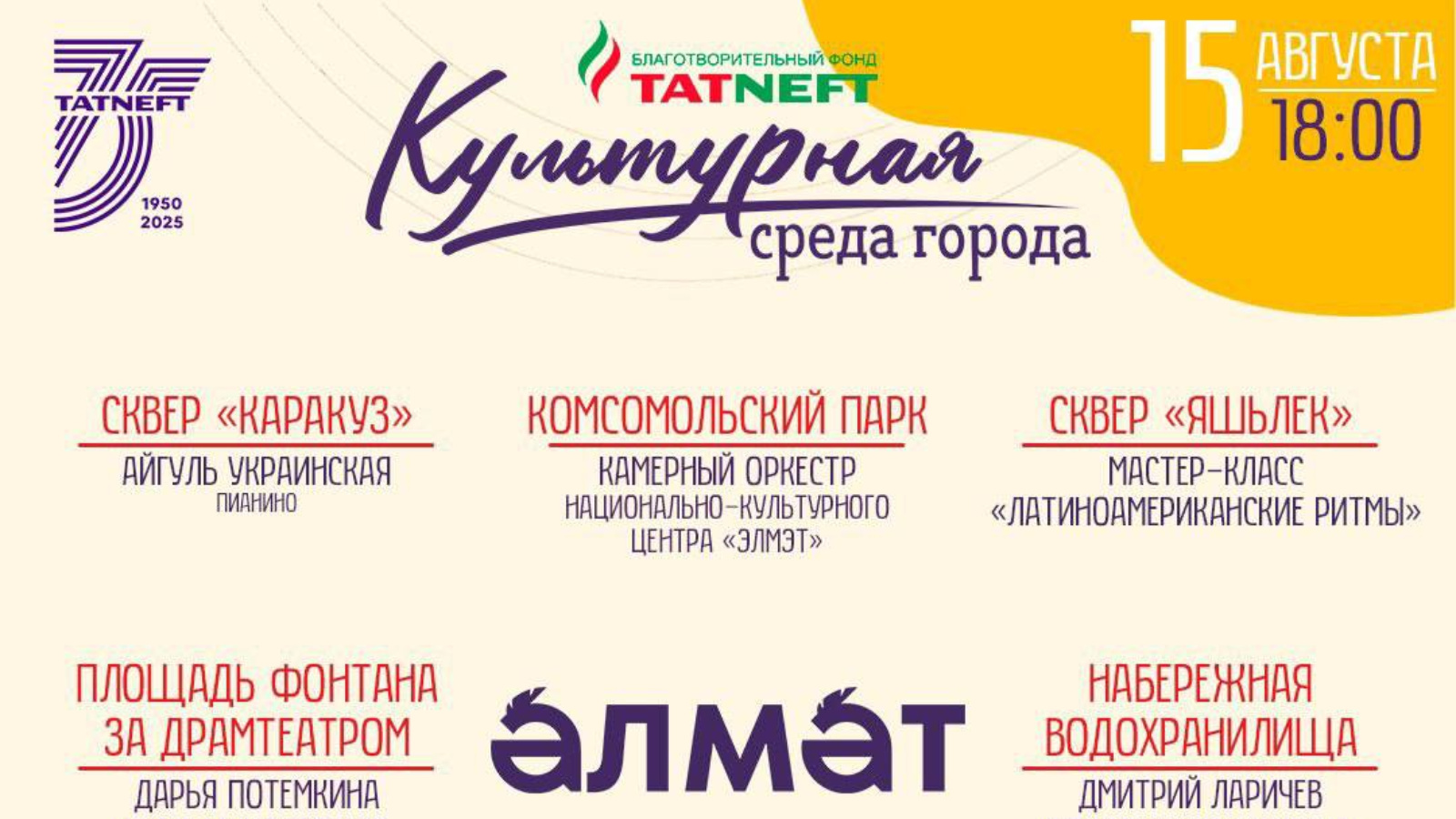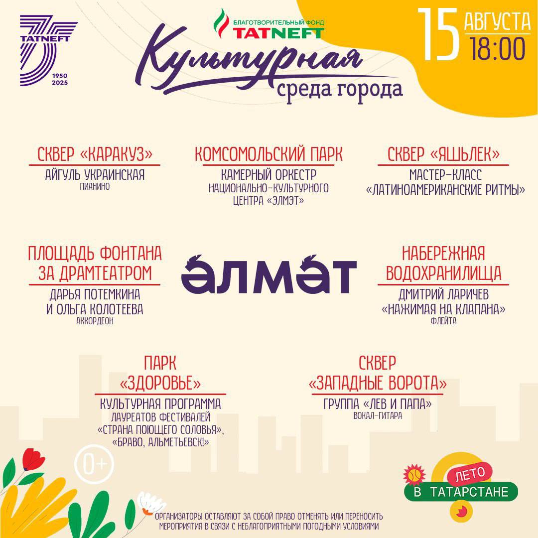 15 августта «Татарстанда җәй» һәм «Шәһәрнең мәдәни мохите» проекты кысаларында җиде шәһәр мәйданчыгында сезне төрле чаралар көтә: концерт чыгышлары, орган музыкасы фестивале, балалар һәм өлкәннәр өчен иҗади мастер-класслар.