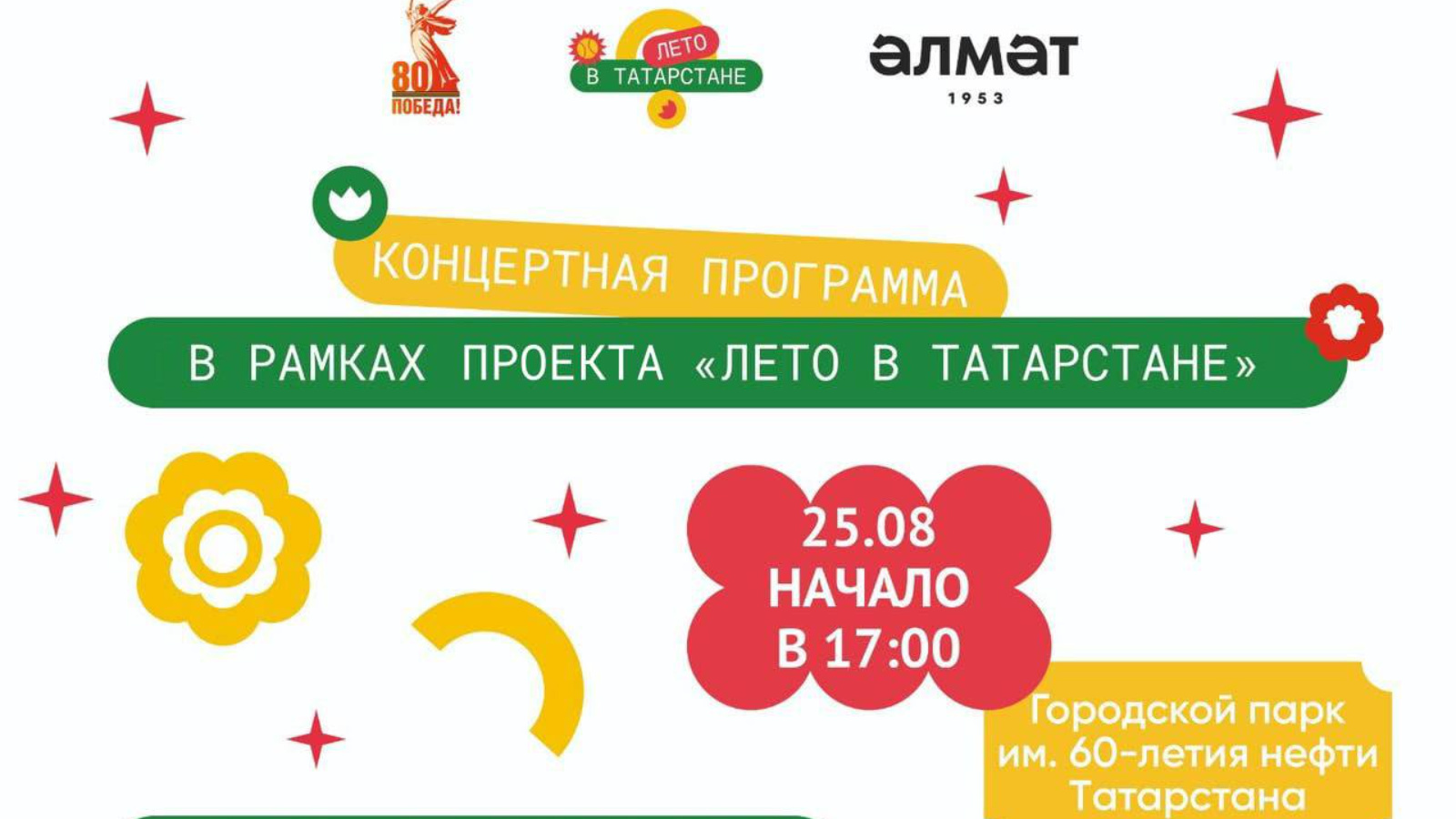 Иртәгә, 25 августта, Татарстан нефтенең 60 еллыгы исемендәге шәһәр паркында «Татарстанда җәй» проекты кысаларында концерт программасы узачак!