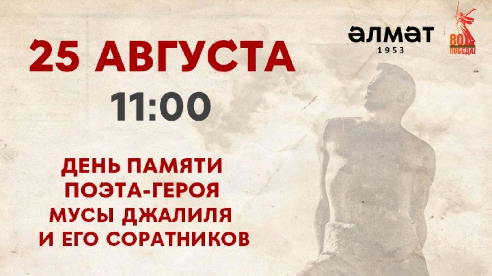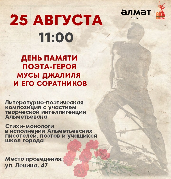 25 августта әлмәтлеләрне герой-шагыйрь Муса Җәлилне искә алу көненә багышланган тантаналы чарага чакыралар. Чара 11:00 сәгатьтә башлана (Ленин һәм М.Җәлил урамнары киселеше).