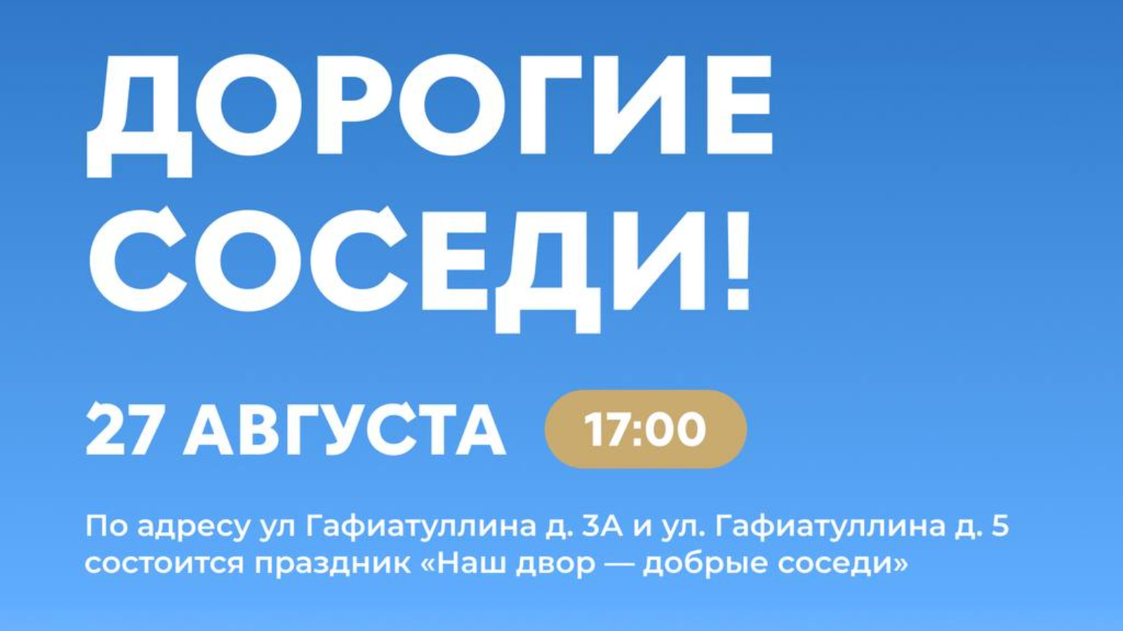 Бүген 17:00 сәгатьтә «Безнең ишегалды» программасы буенча Гафиятуллин урамы, 3А һәм 5 йортларда төзекләндерелгән ишегалдын ачу тантанасы булачак!