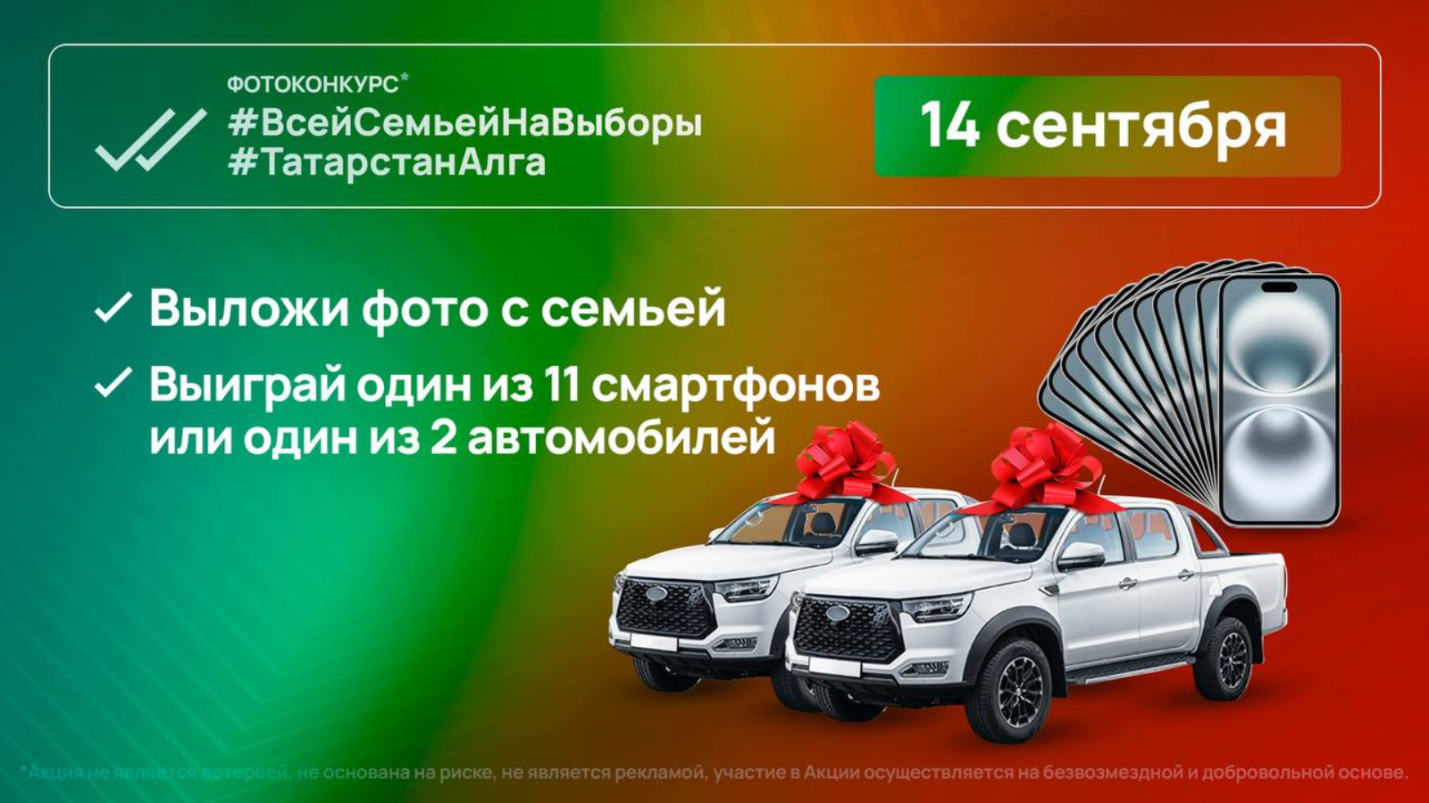 14 сентябрьдә, Татарстан рәисен һәм муниципаль депутатларны сайлау көнендә #ТатарстанАлга #Всейс-сайлау фотоконкурсы узачак. Аның нәтиҗәләре буенча автомобиль яки смартфон отарга мөмкин.