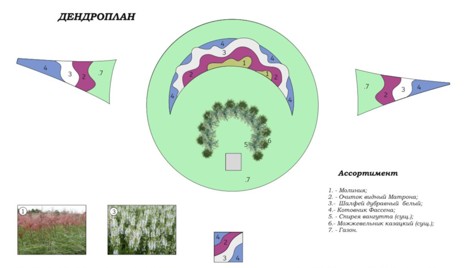 Композицияләрнең нигезенә күпьеллык культуралар: мәче үләне, шалфей, очиток, герань, Приморье армериясе, эхинацея, шулай ук декоратив кыяклылар — молиния һәм сеслерия ята. Аларны язгы чәчәкләр — крокуслар һәм ботаник лаләләр тулыландырачак.