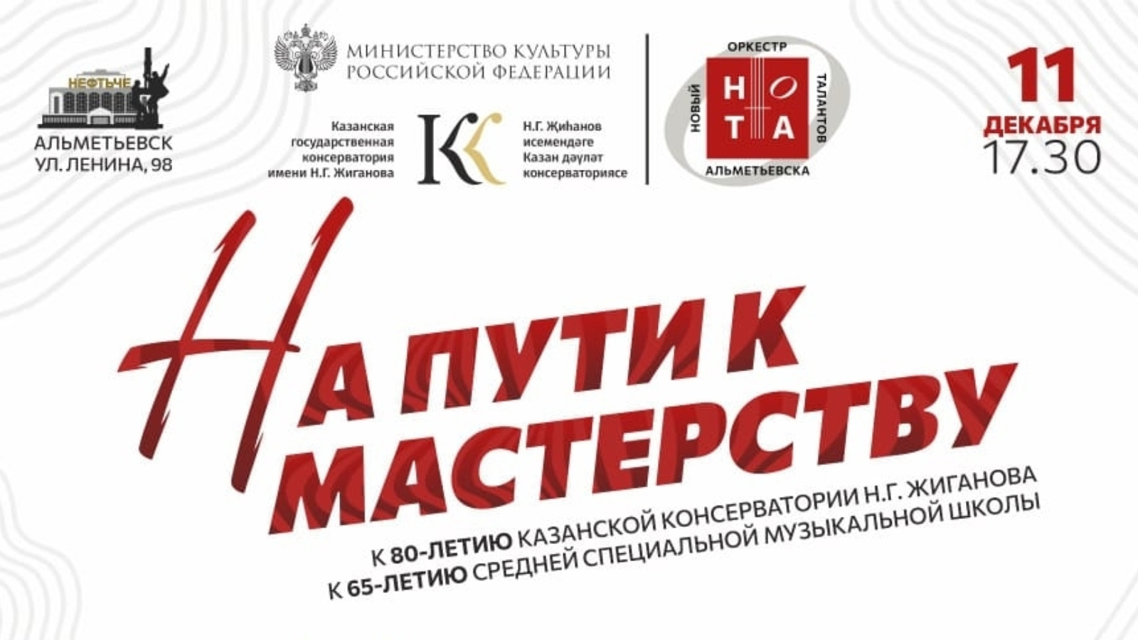 11 декабрьдә 17: 30 сәгатьтә «Нефтьче» мәдәният йортында «Осталыкка юлда» дигән тантаналы концерт була. Чара Н. Г.Җиһанов исемендәге Казан дәүләт консерваториясенең 80 еллыгына һәм урта махсус музыка мәктәбенең 65 еллыгына багышланган.