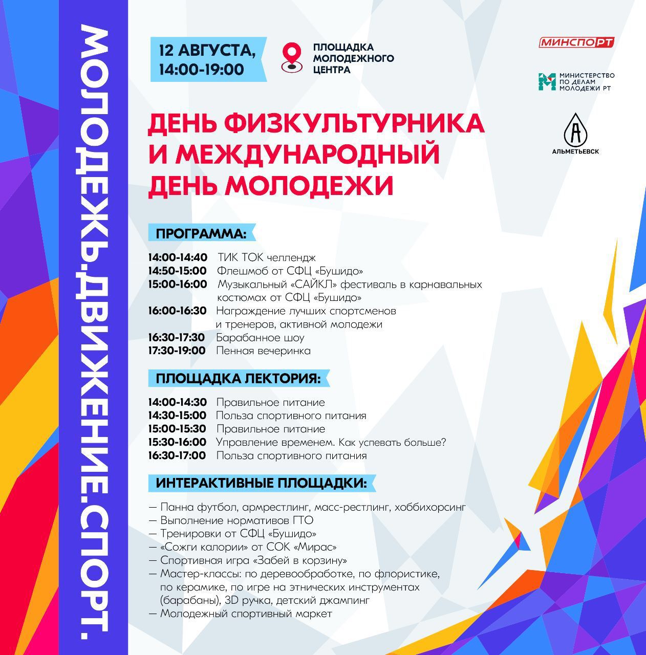 Бәхетле Әлмәттә бу бәйрәм якты, спорт һәм дәртләндергеч булды. Программа бик бай иде. Монда теләгән һәркем педальләрне әйләндерә, джампинг кебек гадәти булмаган спорт төрен сынап карый, үзенең балчык чүлмәген ясый һәм башка төрле мастер-классларда катнаша ала. Интерактив нокталар аз түгел иде. Моннан тыш, якында гынатоорий мәйданчыгы урнашкан, анда дөрес туклану, аның файдасы турында сөйләгәннәр.