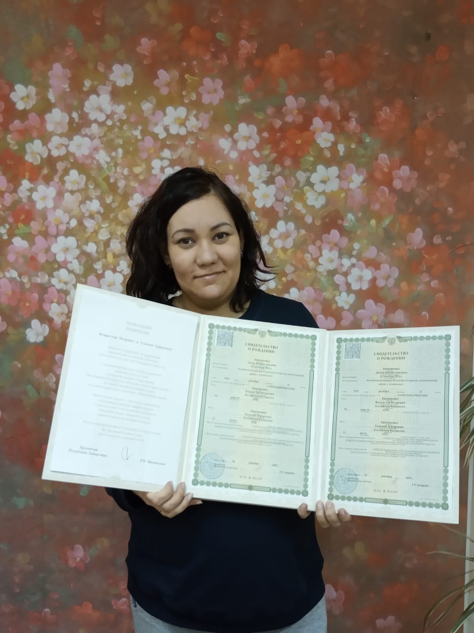 Бәхетле ата-аналар: Байрашевлар, Овсянниковлар һәм Федоровлар гаиләләре ГХАТ идарәсе белгечләре кулыннан беренче дәүләт документын – «туу турында таныклык» һәм Татарстан Республикасы Президенты Рөстәм Нургали улы Миңнехановның котлау хатын алдылар.