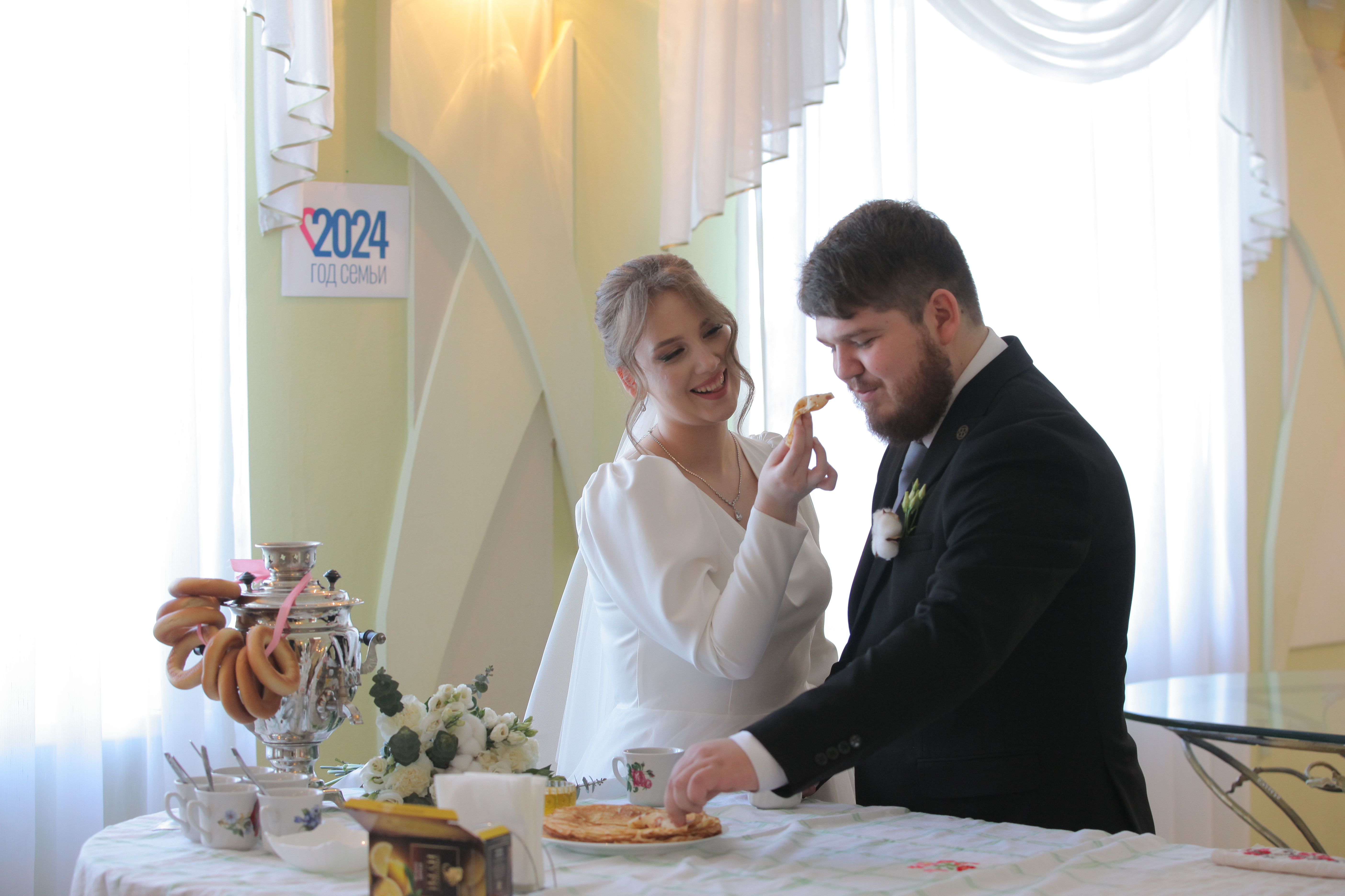 24 февральдә Әлмәт шәһәренең ЗАГС Идарәсе тарафыннан 100 пар яшь пар теркәлгән. Юрий һәм Регина Семеновлар кадерле санның бәхетле ияләре булдылар.