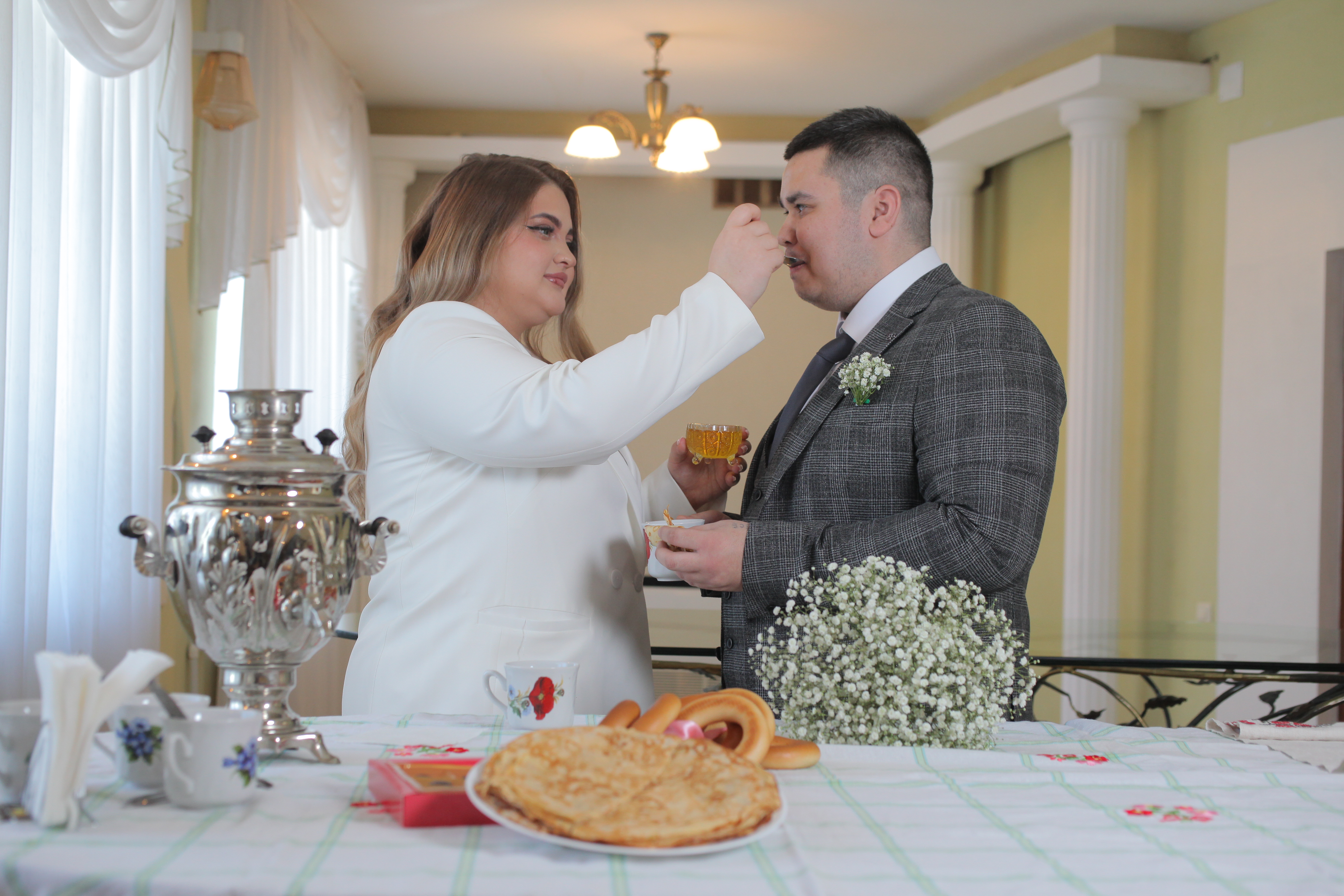 Бүген Тантаналар Сараенда никахларын теркәүче барлык парлар да блиннар белән очраштылар. Җылы, түгәрәк һәм алтын коймак-кояш символы! Борынгыдан ук һәр ашалган коймак белән кеше җылылык һәм кояш яктысы ала дип уйлыйлар!